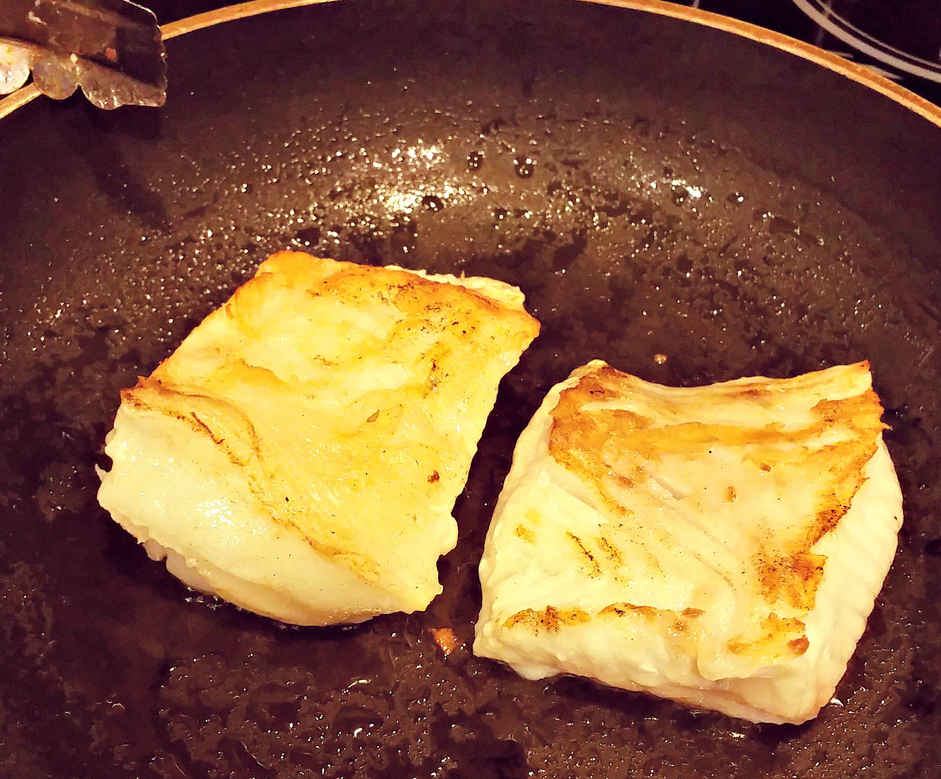 Barely coat a heavy skillet with olive oil. Sear fish on side one for about 5-6 minutes, then flip and cook 2 minutes longer. Finish in a 450 degree oven for 3-4 minutes. This fish is also fantastic grilled.