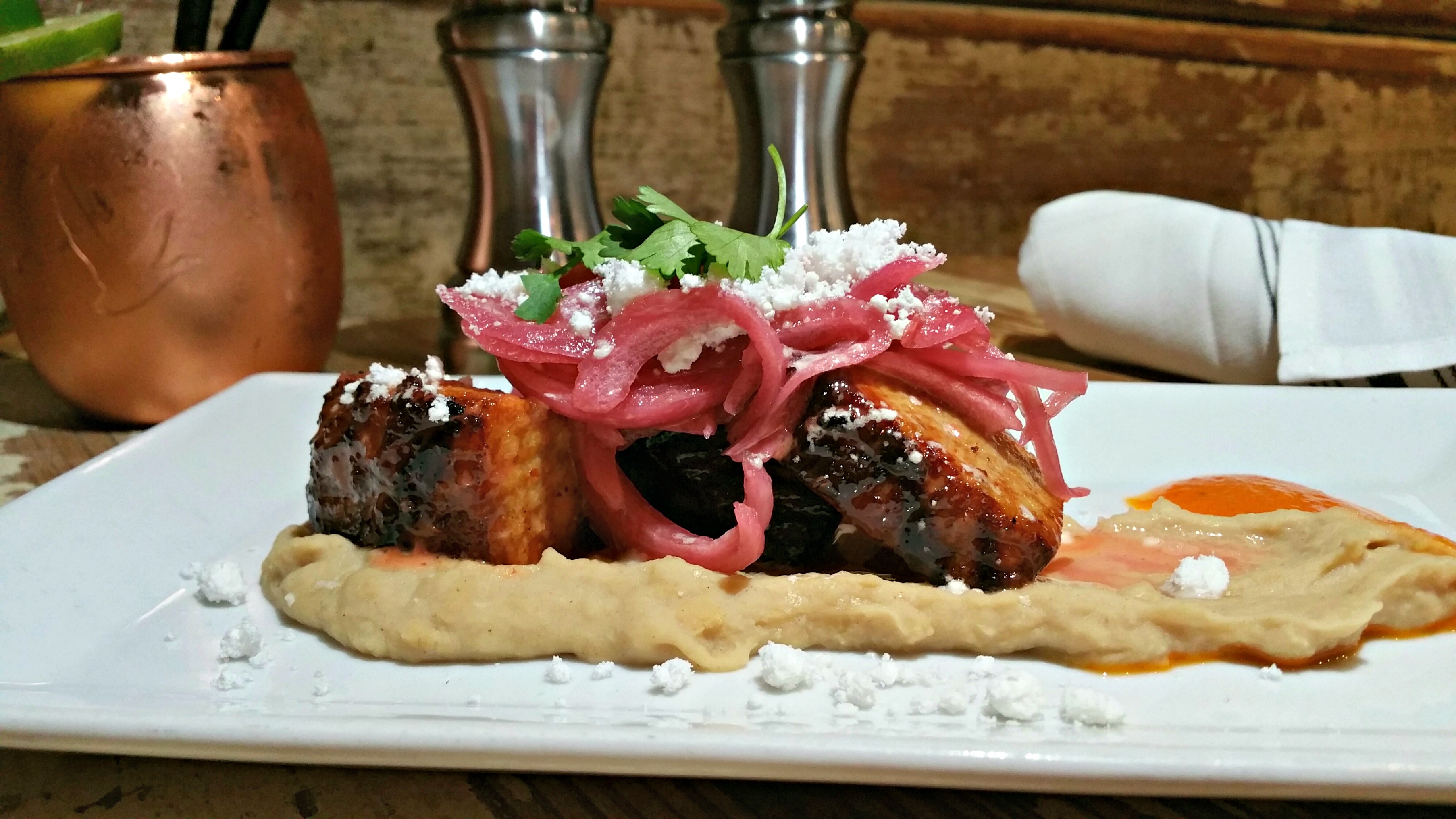 PORK BELLY | blood orange glaze, white bean puree, pickled red onion, hot pepper sauce