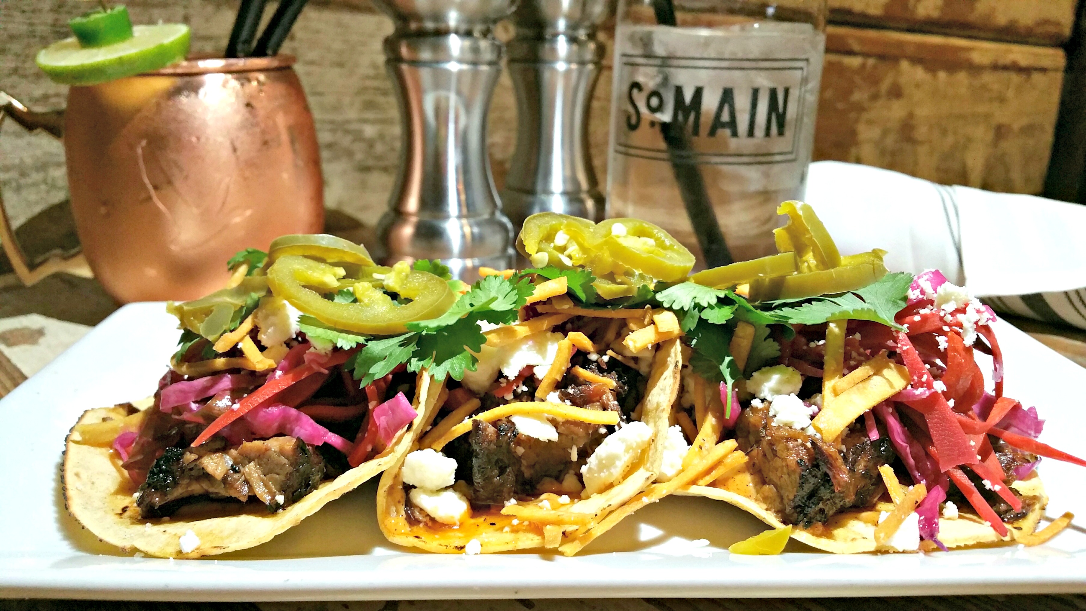 BRISKET TACOS | chili aioli, cabbage slaw, feta, crunchy tortilla, pickled jalapeno