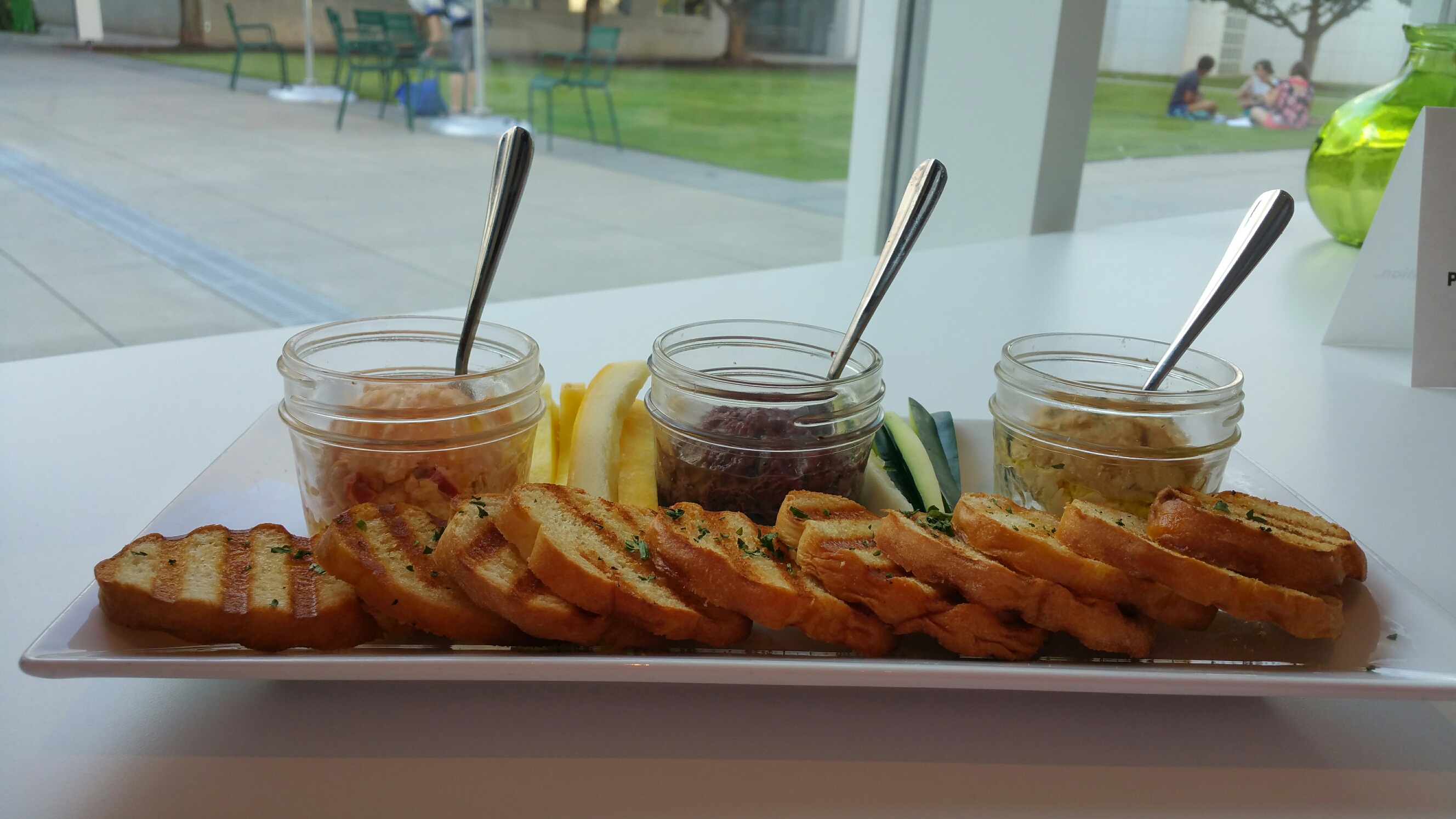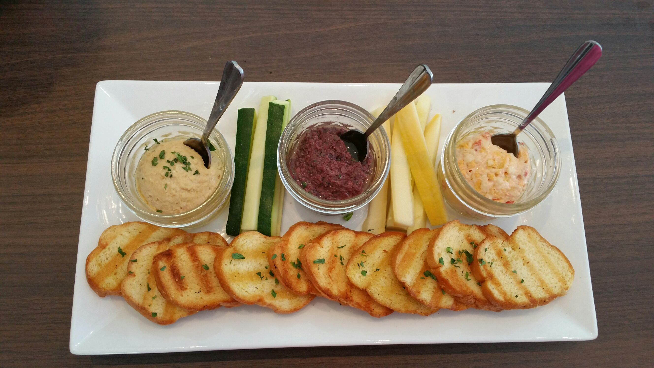 A trio of house made dips followed, including a great olive tapenade, hummus, pimento cheese, fresh veggies and a perfectly grilled baguette.