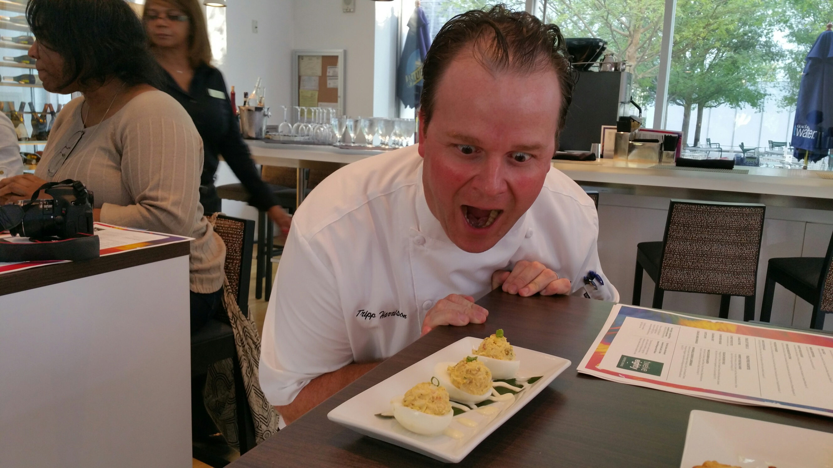 I had many favorites during this meal, but these were my top choice, the creme de la creme, the one dish where we almost came to blows over the last one… I present the star of the show… LOLLIPOP SMOKED CHICKEN WINGS. “Ashley Farms” frenched wings with a Maple Bourbon Glaze were the epitome of delicious. Again, you can tell by the look on Chef’s face, these are something spectacular!