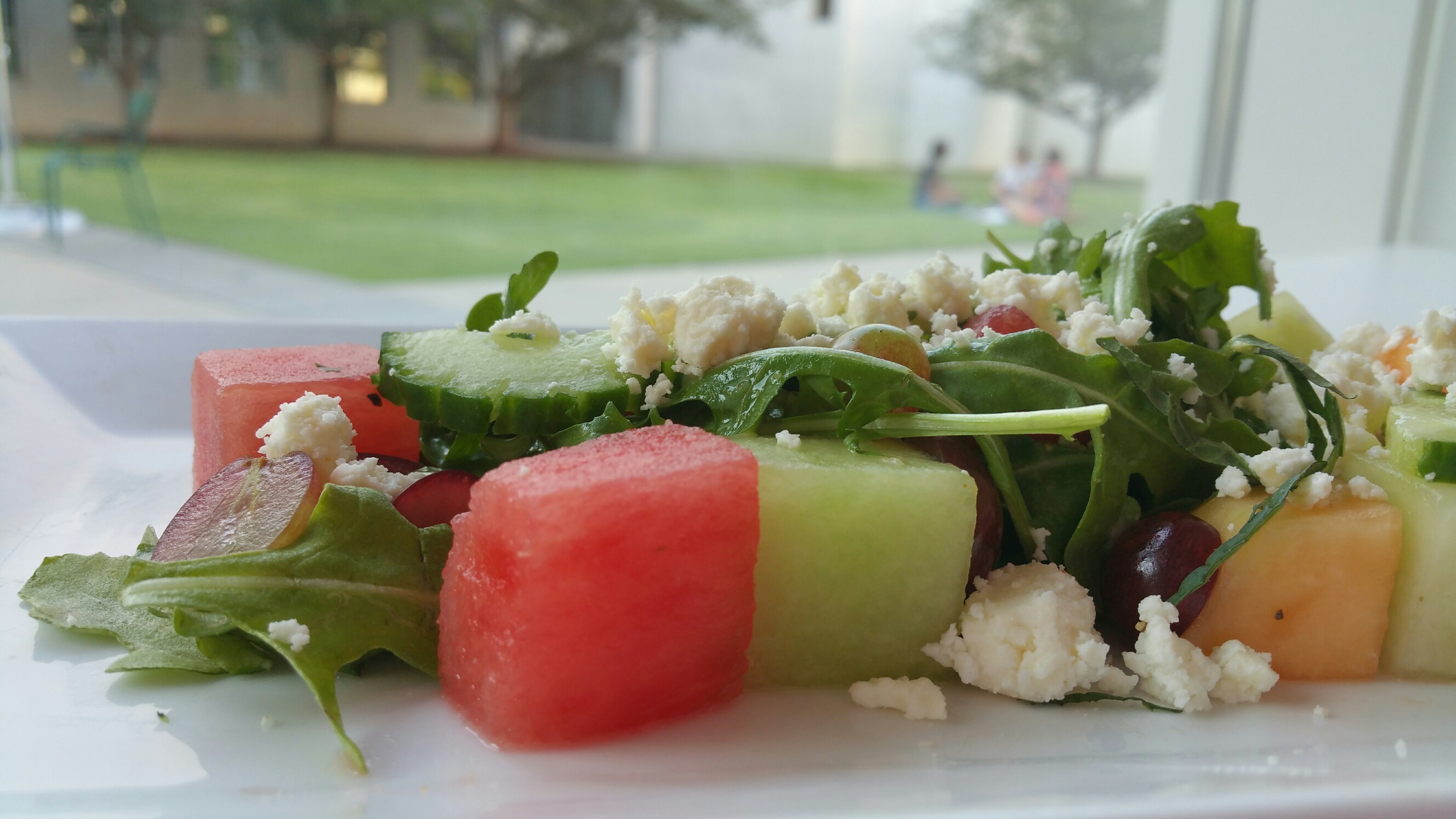 Next on the superstar line up was a fantastic melon and grape salad. This salad was another perfect seasonal choice highlighting fresh cantaloupe, honeydew, watermelon, red grapes, Arugula, fresh mint, crumbled Feta, Euro Cucumber and dressed with a very tasty honey lavender white balsamic