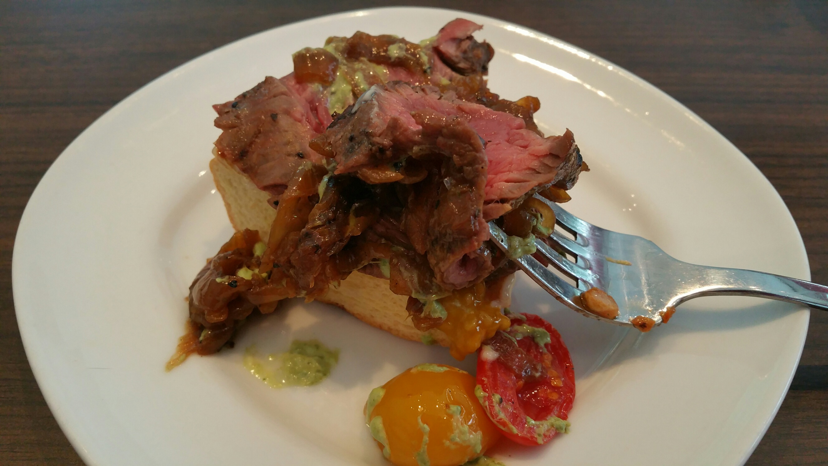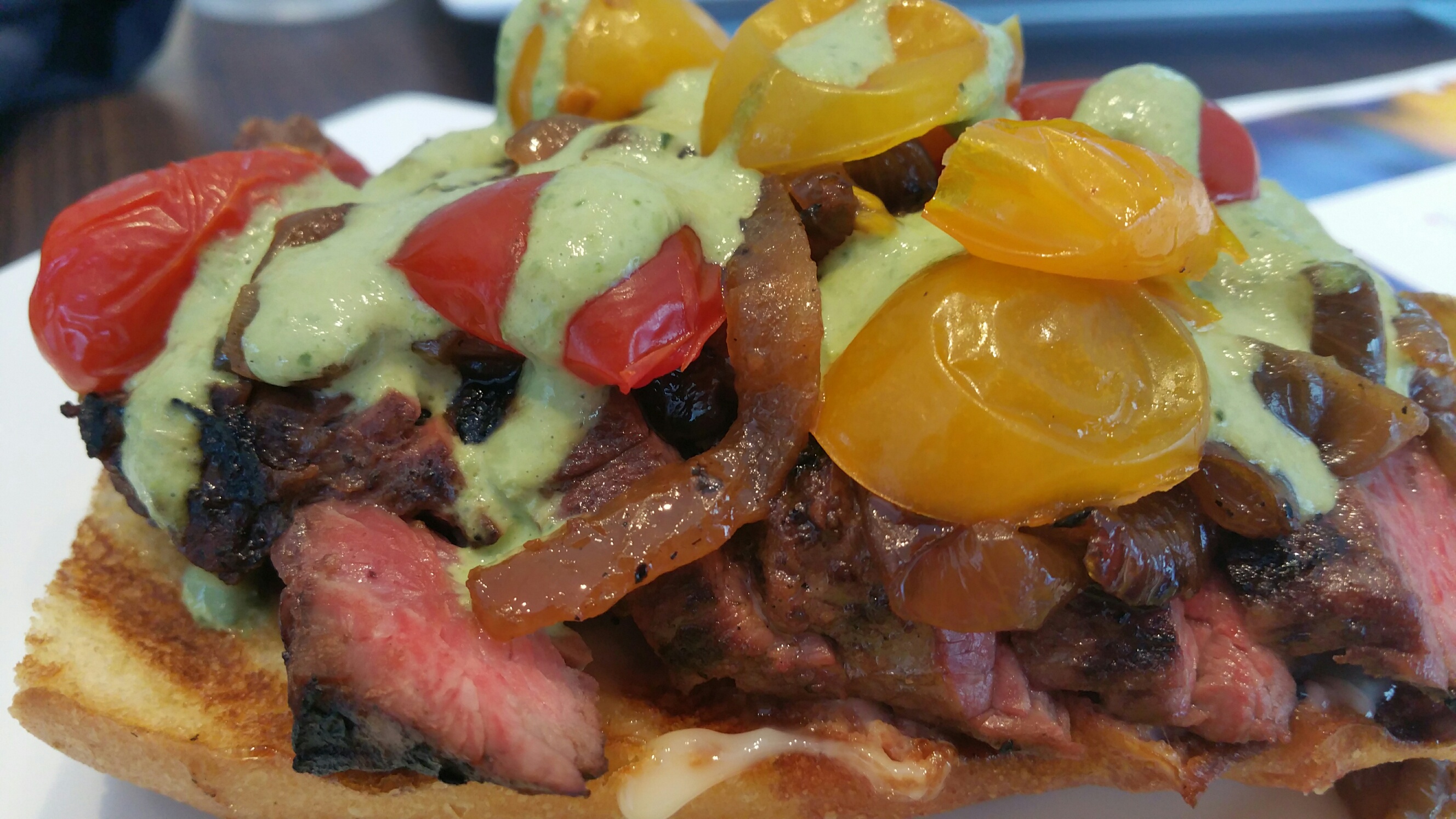 …and a decadent Open Faced Bruschetta Steak Sandwich with baby red and yellow grape tomatoes, caramelized onion, roasted garlic aioli, pressed baguette and basil Crème Fraiche.