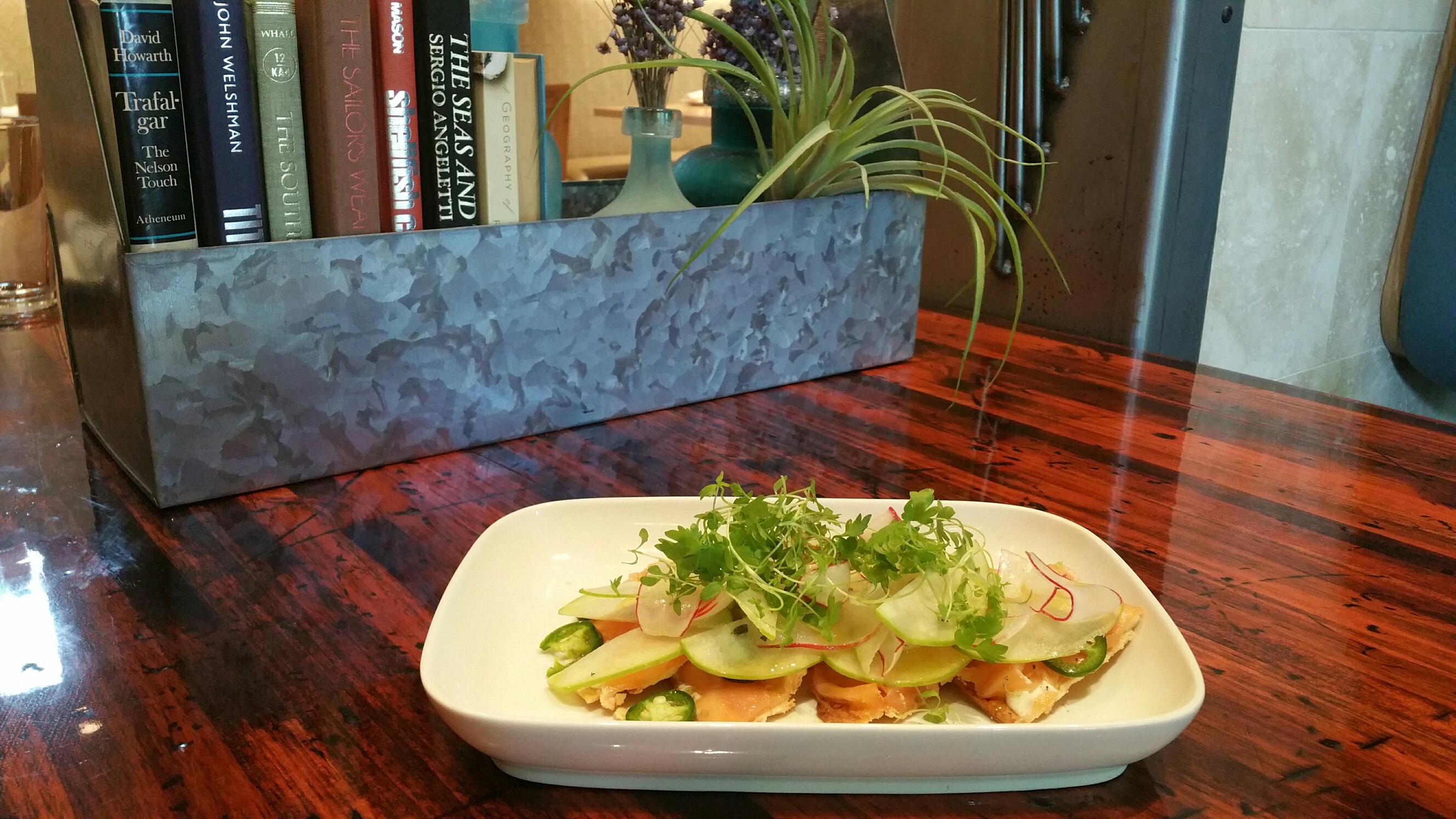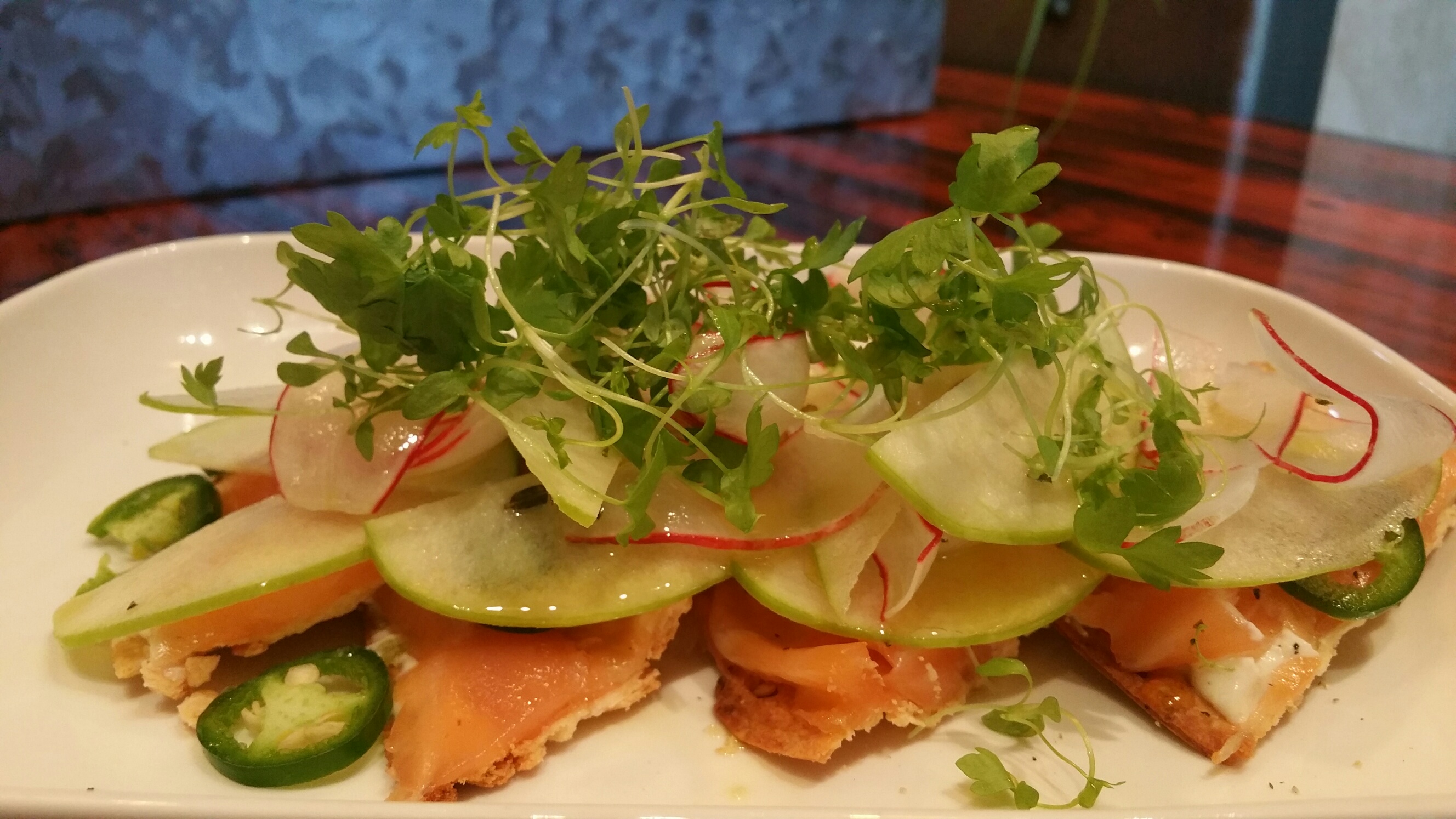 My first treat was the BOURBON CURED SALMON with benne seed cracker, apple and jalapeno cream. Although smoked salmon, or any salmon is my husband’s universal favorite food, I’ve not ever really been a huge salmon fan. This dish though was amazing. The jalapeno cream suited the salmon perfectly without being overwhelming. The apple was the perfect accent of sweetness to marry the spice of the cream. It was excellent.