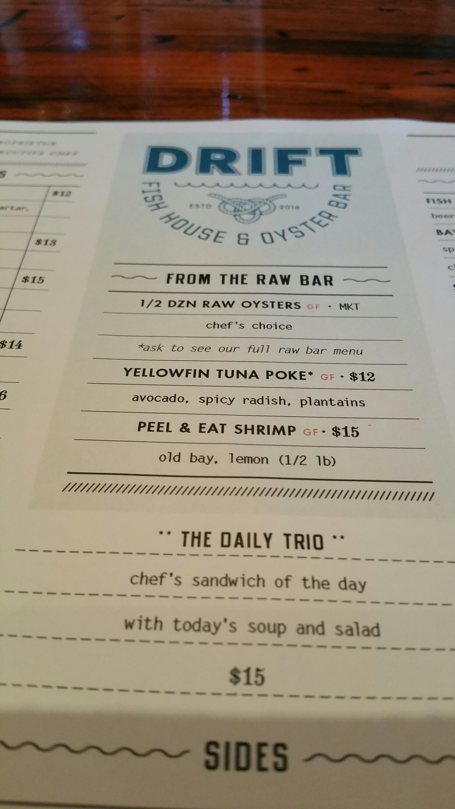 Drift Fish House & Oyster Bar in Marietta has provided a seven day a week, 12 hour a day answer to my dilemma. Serving both lunch and dinner, their menus are creative, and their food is nothing less that stellar.