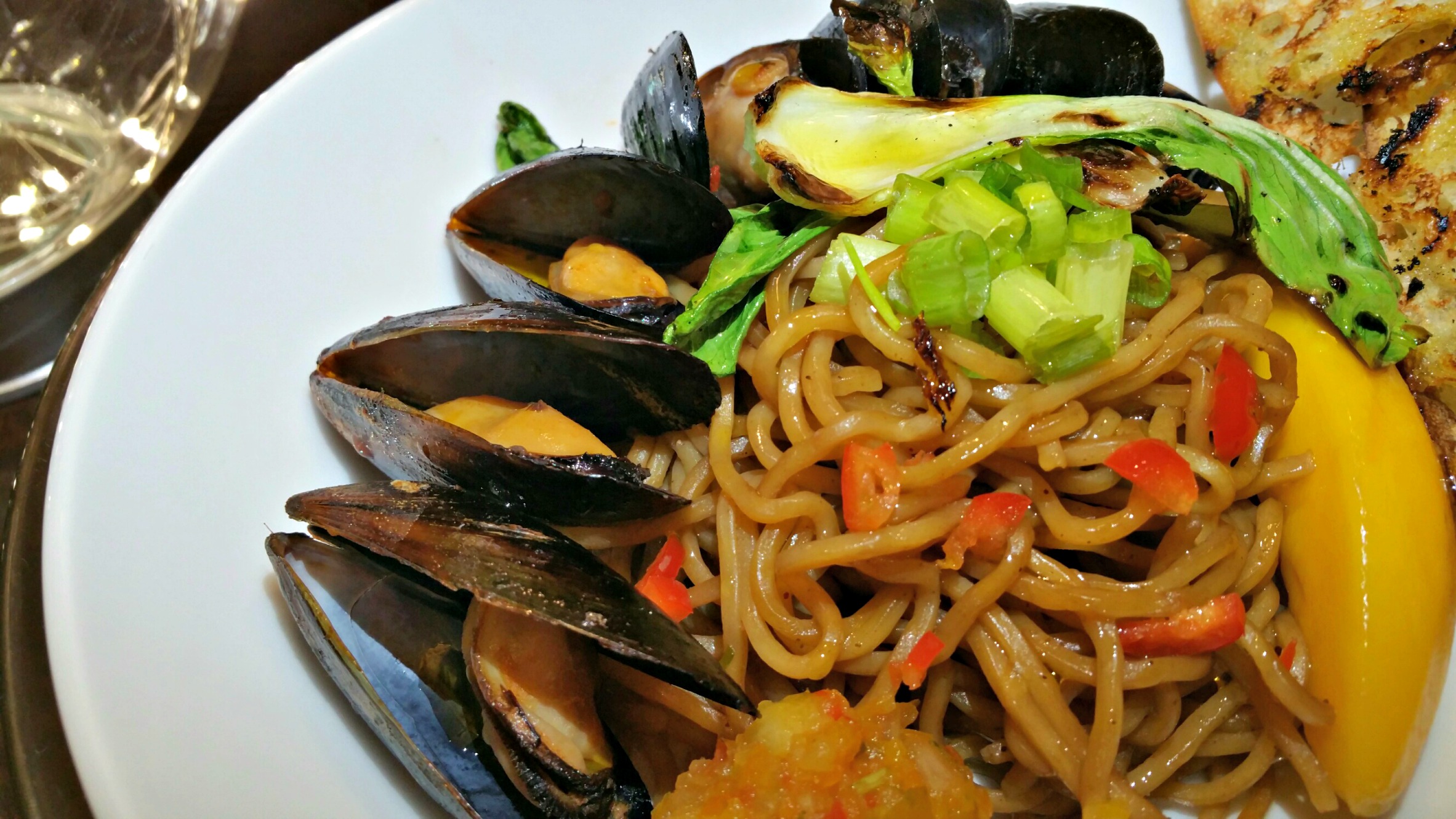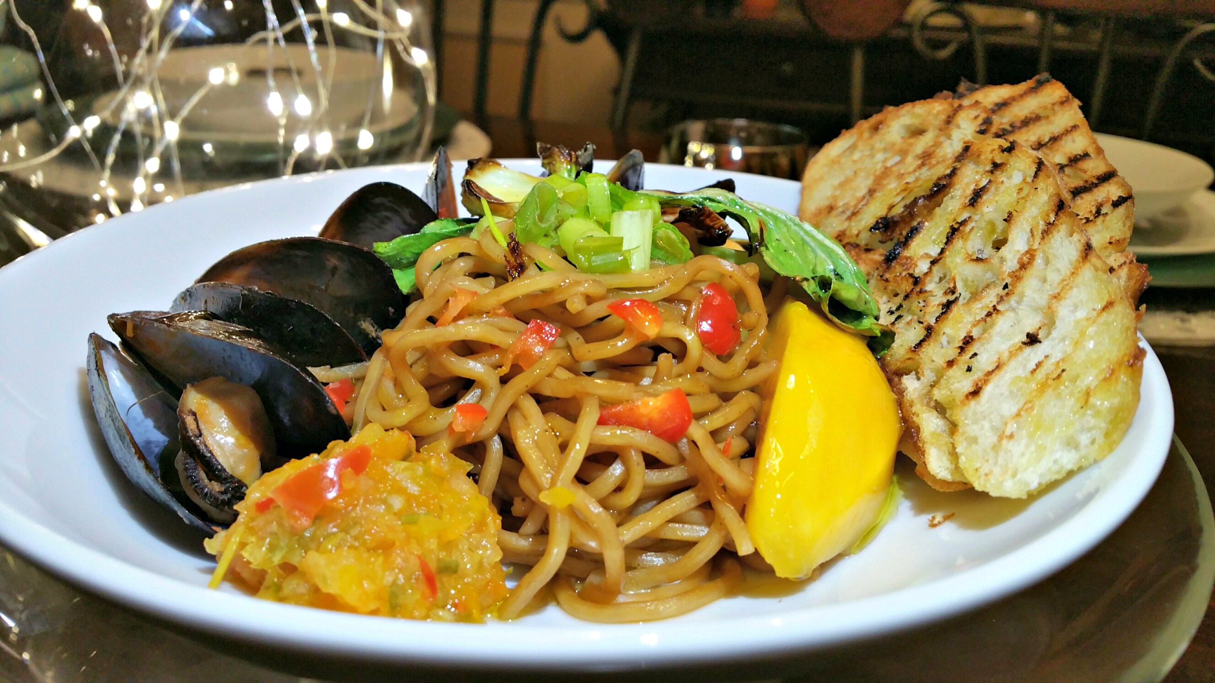 Prepare Yakisoba Noodles according to package directions. Toss with mango, green onion, red pepper, bok choy, ginger and sweet onion. Chill for at least an hour, then serve topped with mussels and grilled bread if desired.