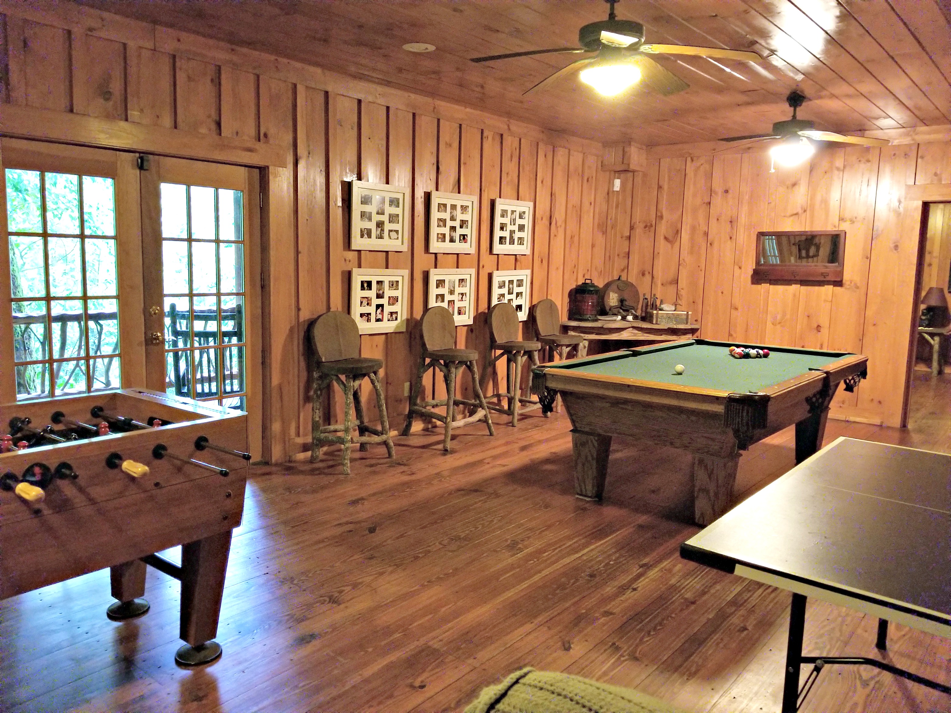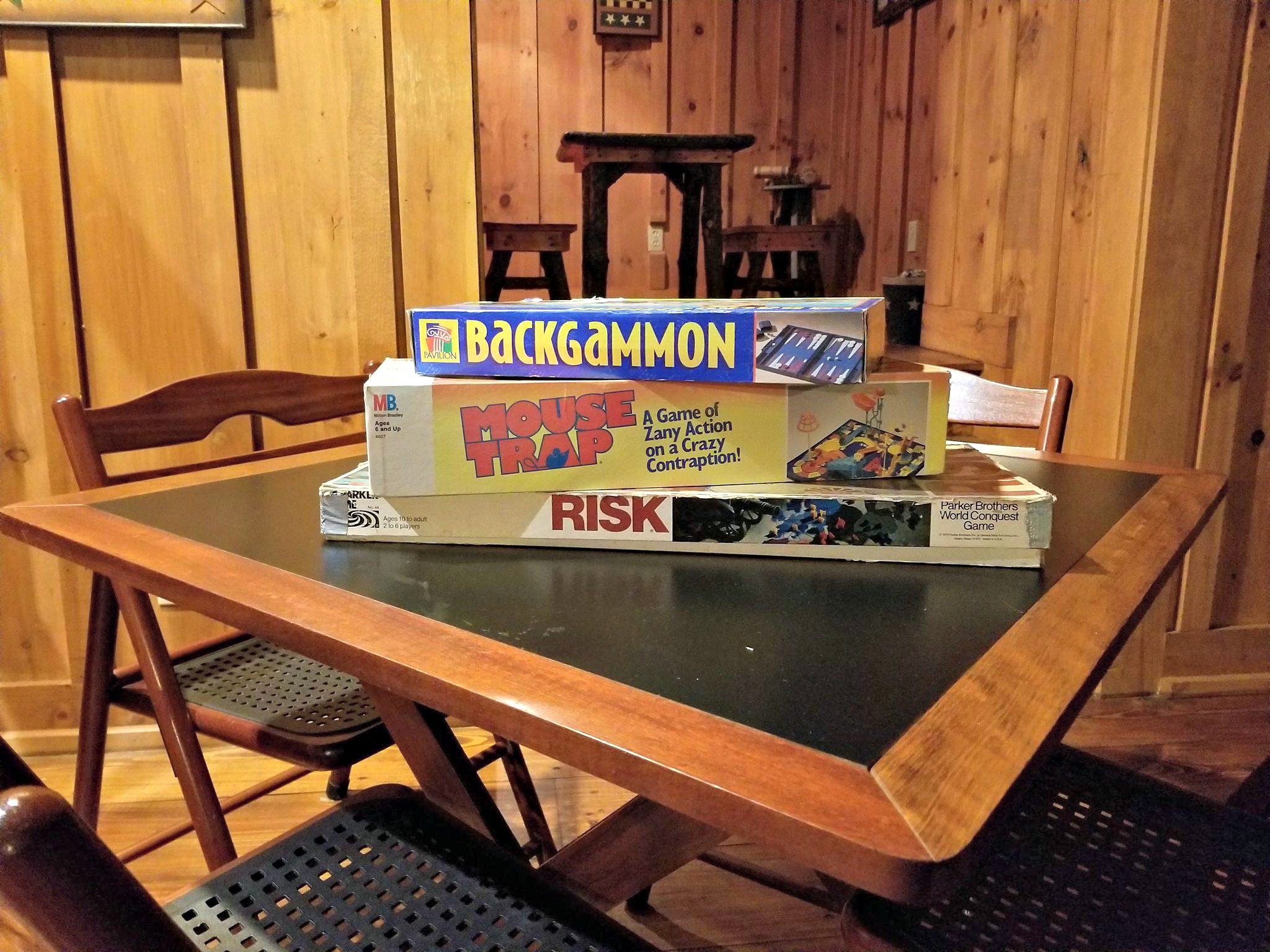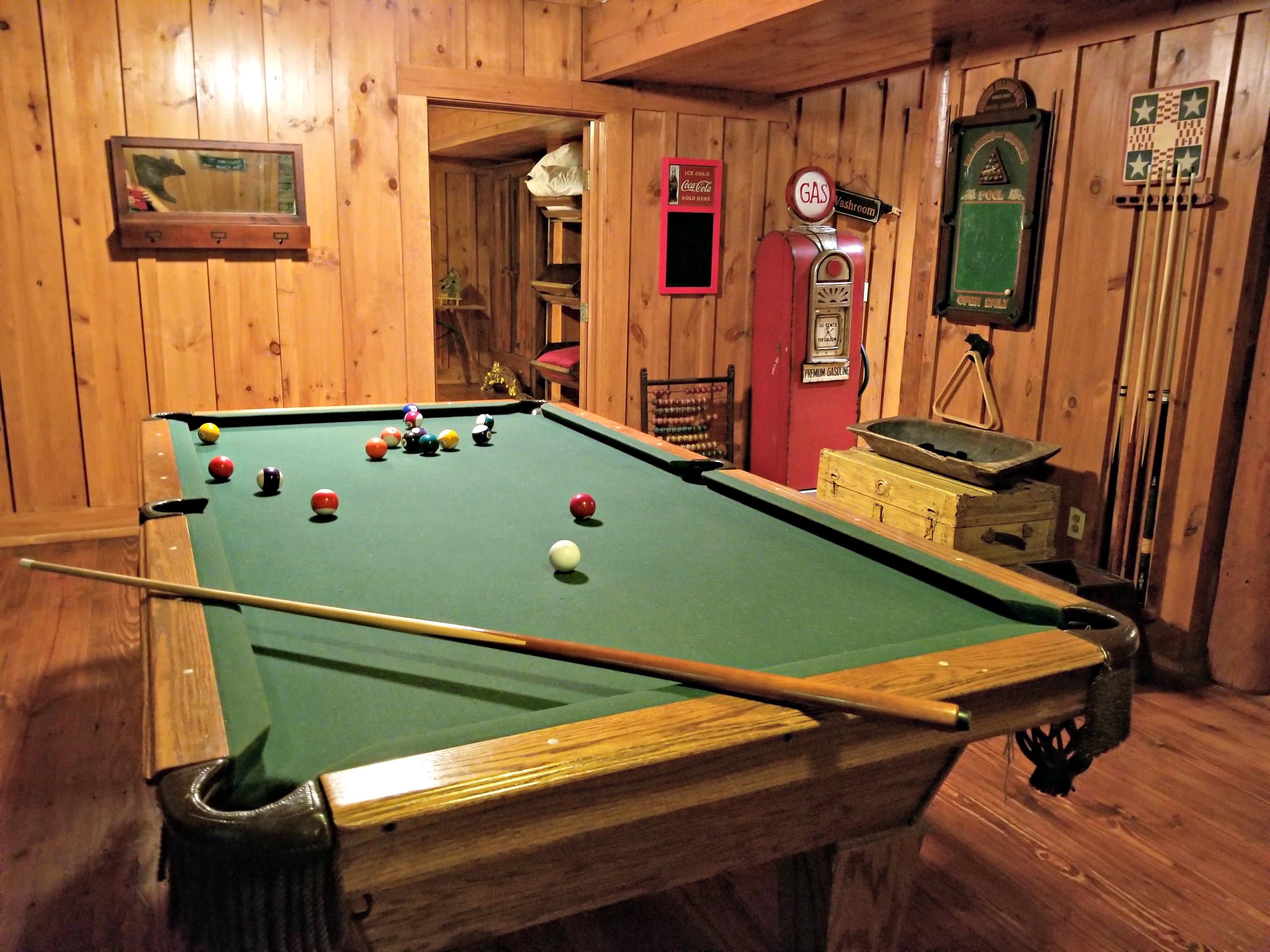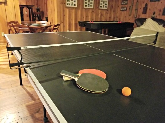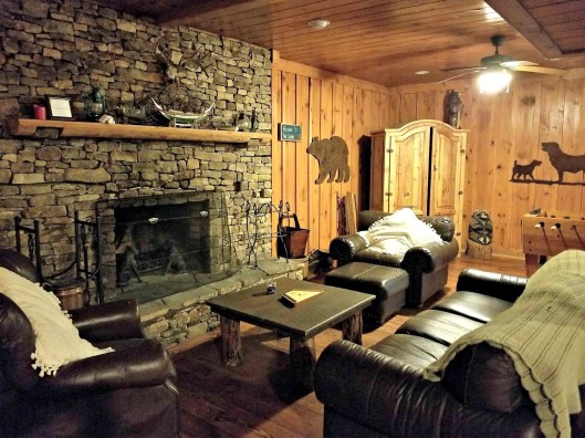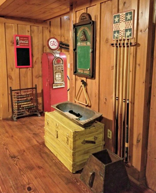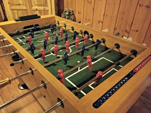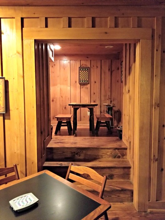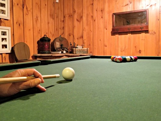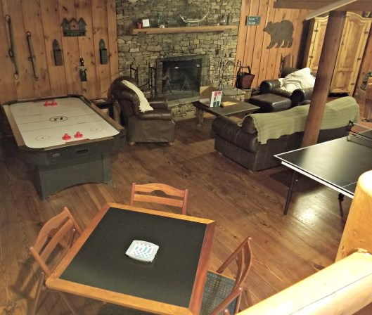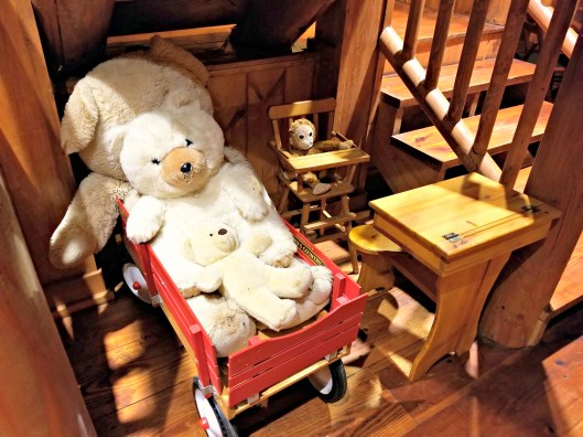 Later that evening we decided to become kids again, spending the evening in the huge game-room on the lower level. We literally spent hours playing games by the stone fireplace in the game-room, and enjoying a little after dinner brandy. We played air hockey, ping pong, shot three games of pool, played board games, checkers in the checkers cubbyhole and Foosball. They also have DVD & VCR movies, additional books, and a children’s toy cubbyhole with a gigantic teddy!
